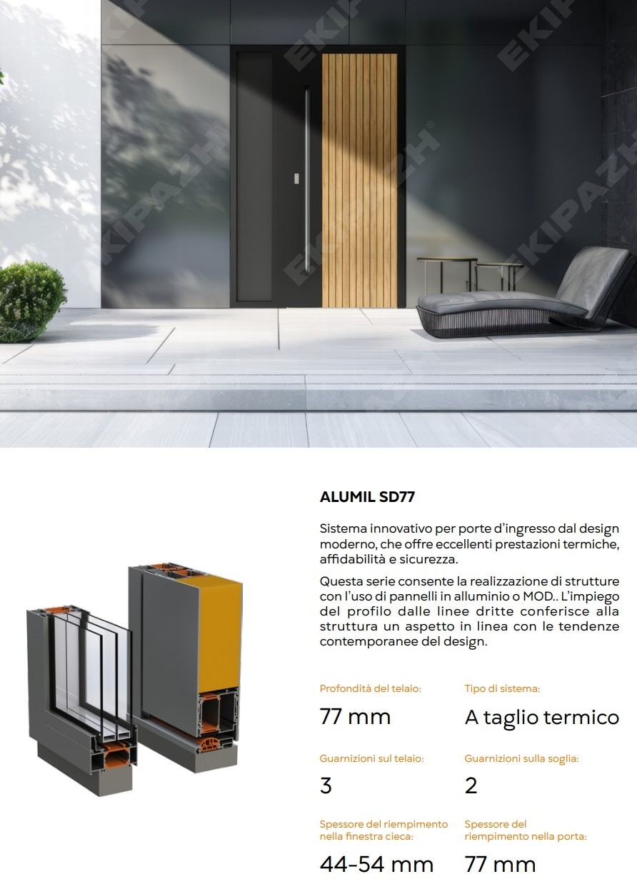 Le porte d’ingresso in alluminio rappresentano una soluzione moderna e performante per chi desidera coniugare estetica, sicurezza e comfort abitativo. Grazie alla struttura robusta e leggera, l’alluminio garantisce un’elevata resistenza agli urti, agli agenti atmosferici e all’usura quotidiana, mantenendo nel tempo forme stabili e finiture impeccabili, senza deformazioni o necessità di manutenzioni complesse.